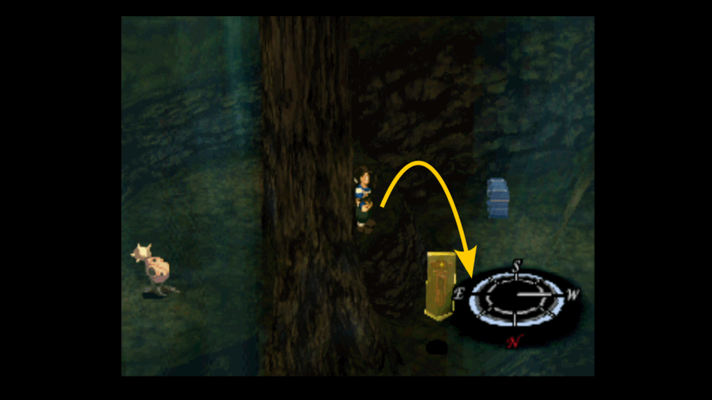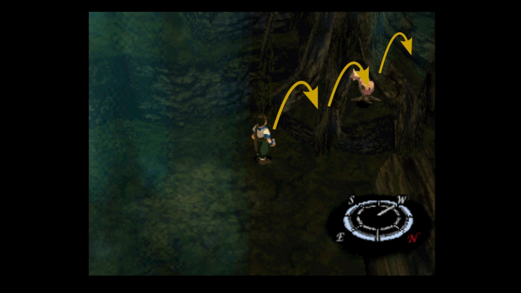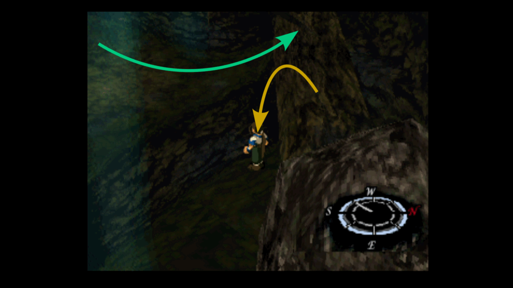 転がってくる岩を左に避けて落ちました(黄色矢印)